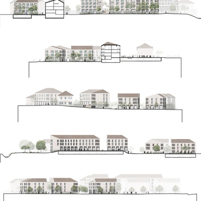 Missions : Réaménagement urbain de la place centrale : espaces publics et paysagés, commerces, logements